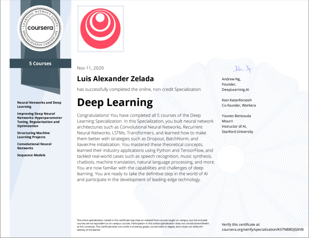 Este post estará dedicado al primer curso online que me hizo sentir muy feliz y orgulloso fue La especialización de Deep Learning dictada por Andrew NG (el mejor) en Coursera, y es que les voy a ser sinceros no fue nada fácil primero porque todo estaba en inglés y tenía que volver a repasar matemáticas, pero como dice Andrew NG al final de cada video: