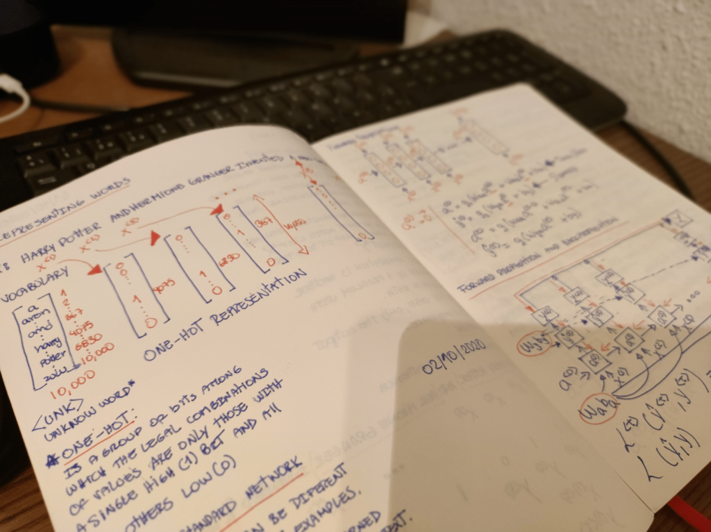 Esa frase fue crucial para poder continuar con la especialización y no es broma porque es un mes por cada curso y son cinco!! Luego para recordar tomaba apuntes de cada tema en un bloc de notas en físico de esta forma era mucho más fácil hacer los ejercicios que te dejan cada semana, hay que tener en cuenta que en más de una ocasión tendrás que repetir el video para entender el concepto (si tu motivación es aprender no te importará) abajo una foto de mis apuntes: